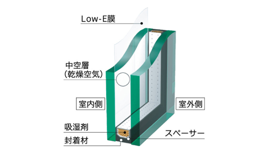 断熱性の高いLow-E複層ガラス。2枚のガラスの間に空気層を設けることで外気温への影響を軽減します。